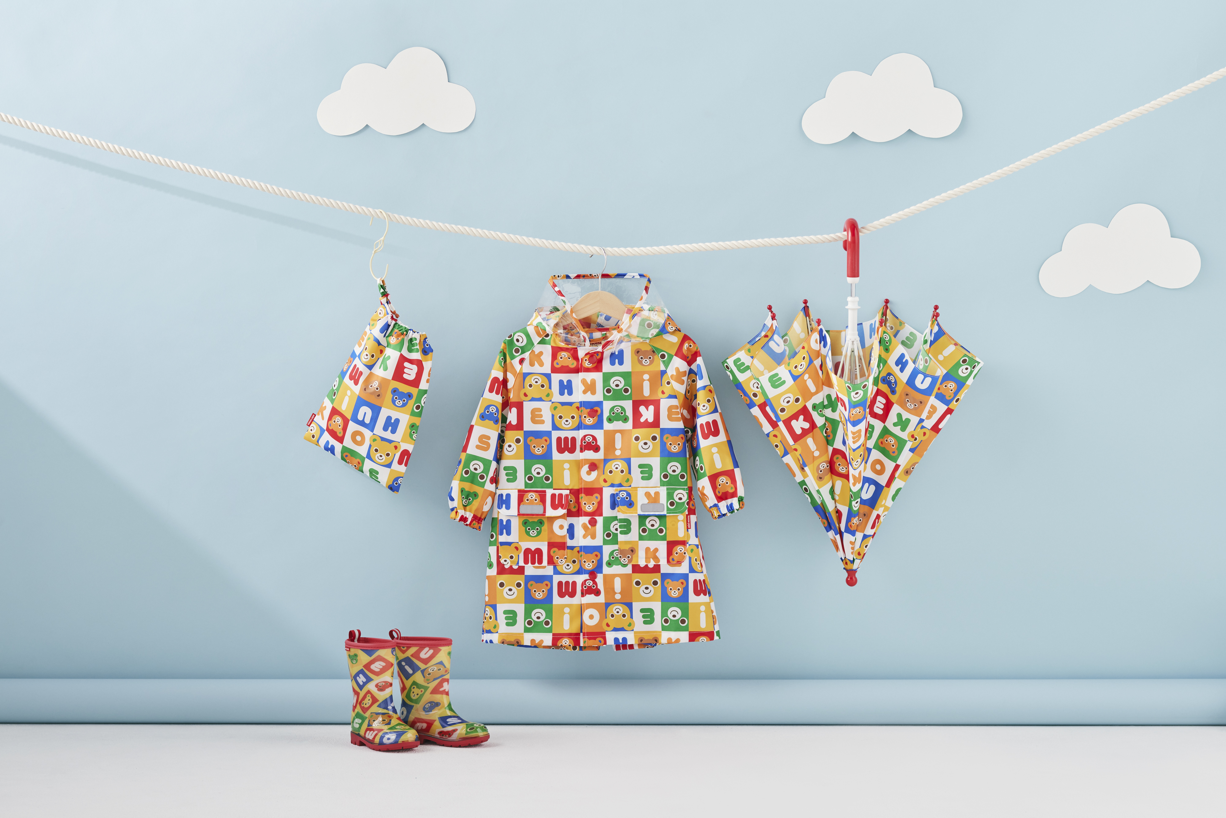 ・下雨天也可以讓心情變成晴天的可愛的積木方格普奇熊圖案的雨衣。