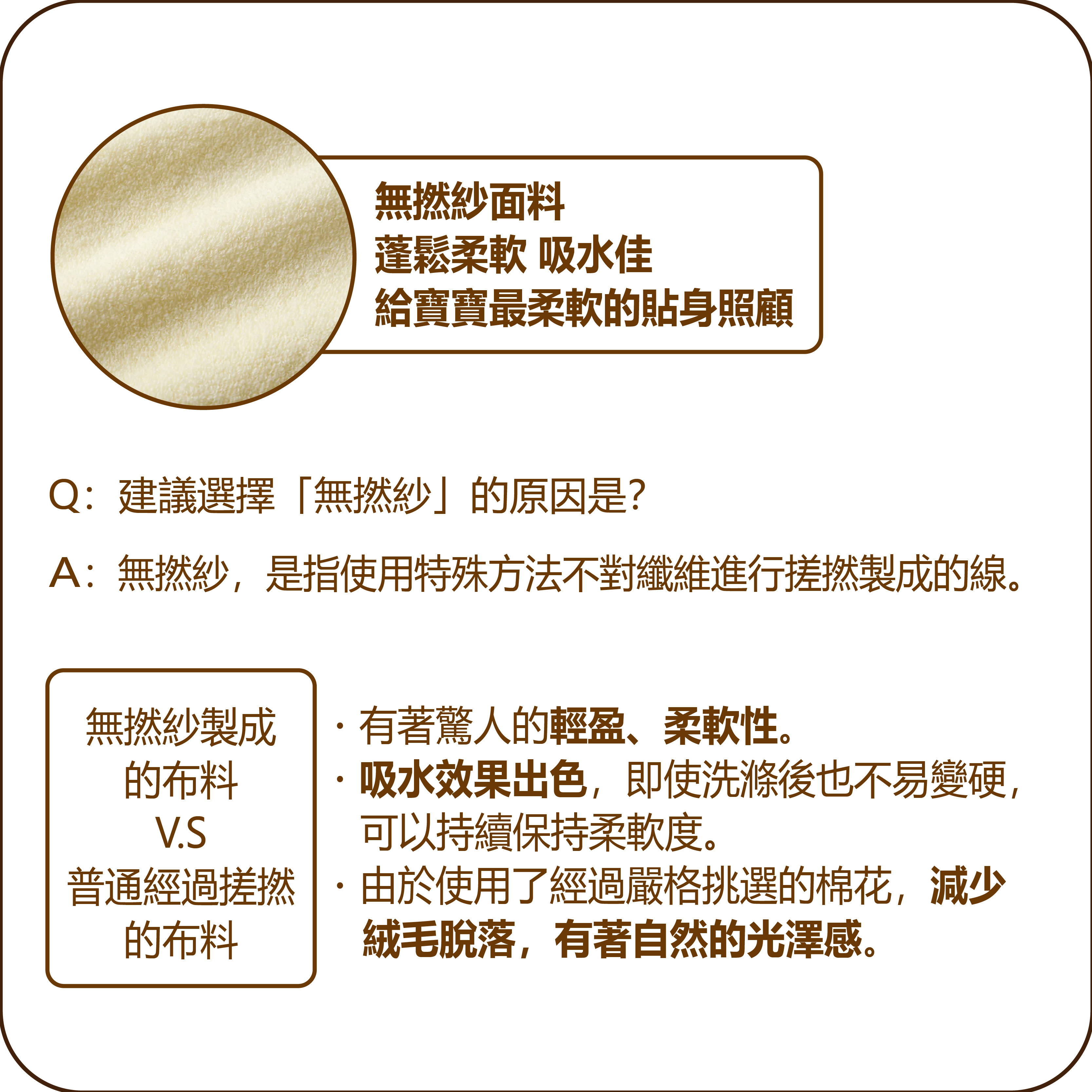 ・該材料使用不經撚紗(無撚紗)製成,因此具有蓬鬆柔軟和彈性的質地。