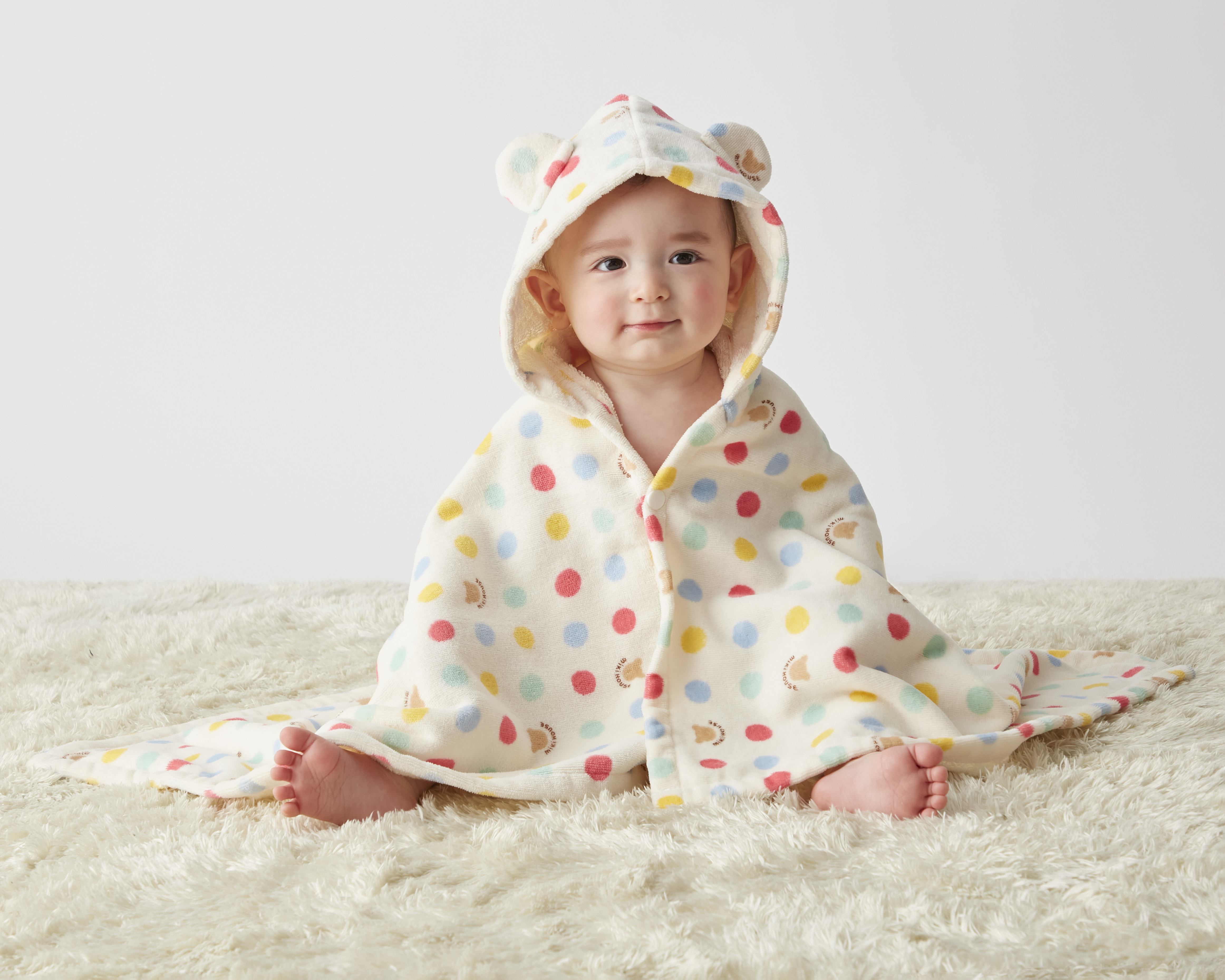 ・這款連帽浴斗篷飾有圓點和小熊圖案。